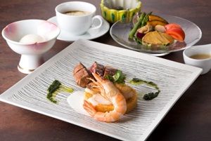 3層吹抜けの自然光あふれる広々とした1階レストラン「グランカフェ」では、魚料理もしくは肉料理を選べるメインが嬉しいランチコースを販売。