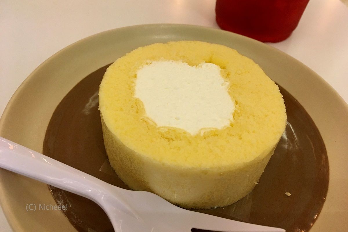 試しに、頼んで食べてみました。味は極めて普通の、ロールケーキ。甘すぎずでしたが、味のクオリティとしては値段相応でした。