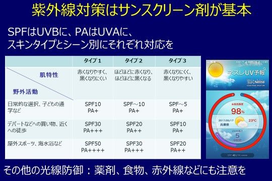 紫外線対策はサンスクリーン剤が基本。SPFはUVBに、PAはUVAに効果があります。以下のようにスキンタイプとシーン別にそれぞれ対応をしてみましょう。UVアプリ予報などの活用もおすすめ。