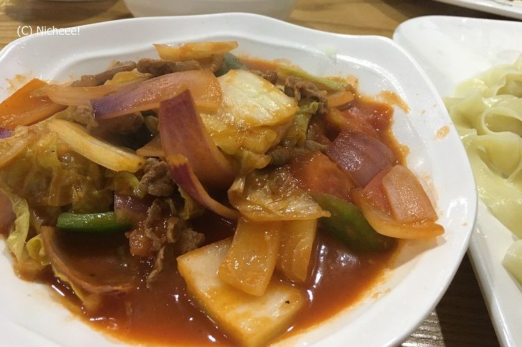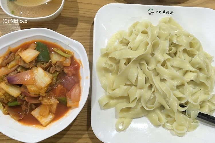 新疆ウイグル料理で定番メニューの1つが、「ラグメン」です。中国語では「拌面」。一見、きしめんのようにも見えます。塩が加わった生地を引き伸ばした麺を釜茹でし、一方、トマトやタマネギなどの野菜と肉を炒めた具と一緒にあえて食べます。