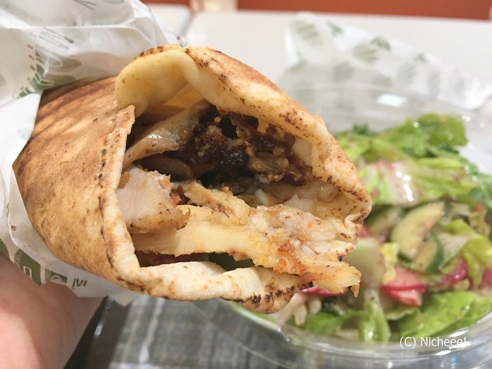 鶏、羊、牛といった肉を串にさしてグリルしたものを薄く削ぎ、トマトなどとともに、ホブスというパンで巻いたもの。日本では「ケバブ」とも呼ばれています。シャウルマだけなら小腹をちょっと満たす軽食に、またサラダやひよこ豆のペースト「ホルモス」などと一緒に食べると、十分ランチ並みのボリュームでした。なかなかやみつきになりそうなおいしさ。