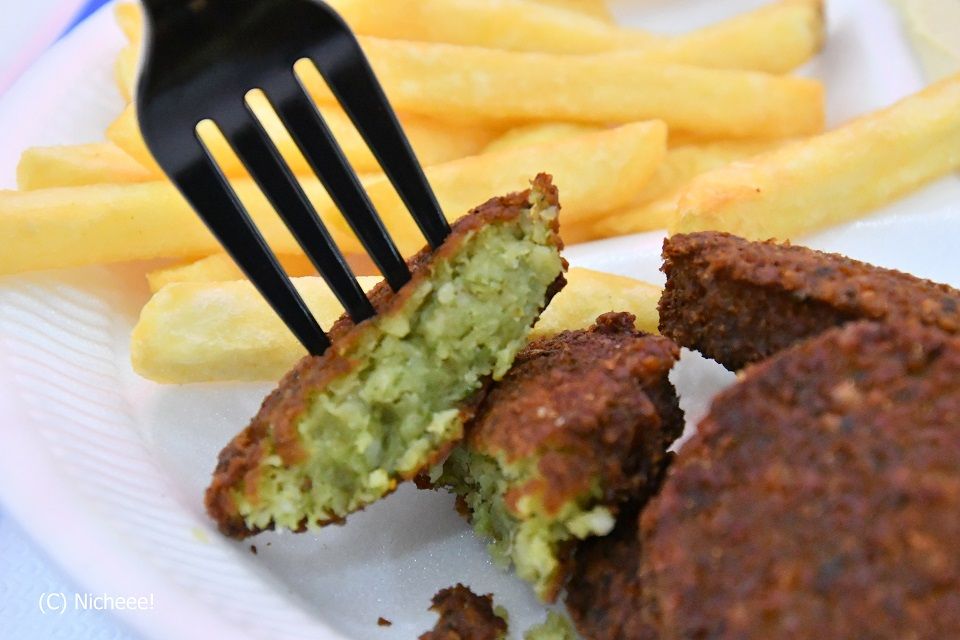 そして、コロッケのような「ファラフェル」。ひよこ豆をつぶして、刻んだパセリや香菜などを混ぜて丸めて揚げてあります。栄養も十分と聞き、いざ食べてみるとなかなかおいしく、こちらもクセになりそうでした。