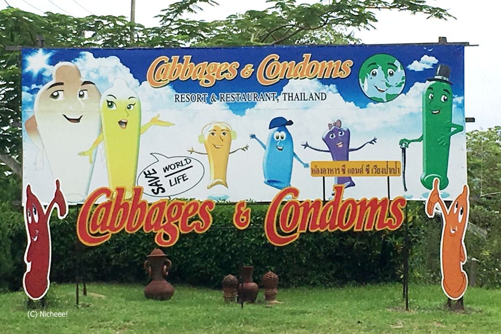 チェンライからチェンマイに向かう道中、休憩に立ち寄った場所に降り立つと、そこで見えたものにしばし目が点になりました。その名も「キャベジズ・アンド・コンドームズ」。しかも、キャベツなどどこにも見当たらず、コンドームの人形が現れたのでもうビックリ。