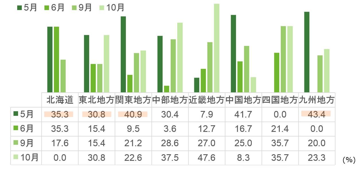 また、運動会の開催時期は地域によっても違いがありました。寒さが厳しくなる北海道では、今も昔も5月・6月に運動会を開催する学校が多いようです。(グラフは今年のデータです)