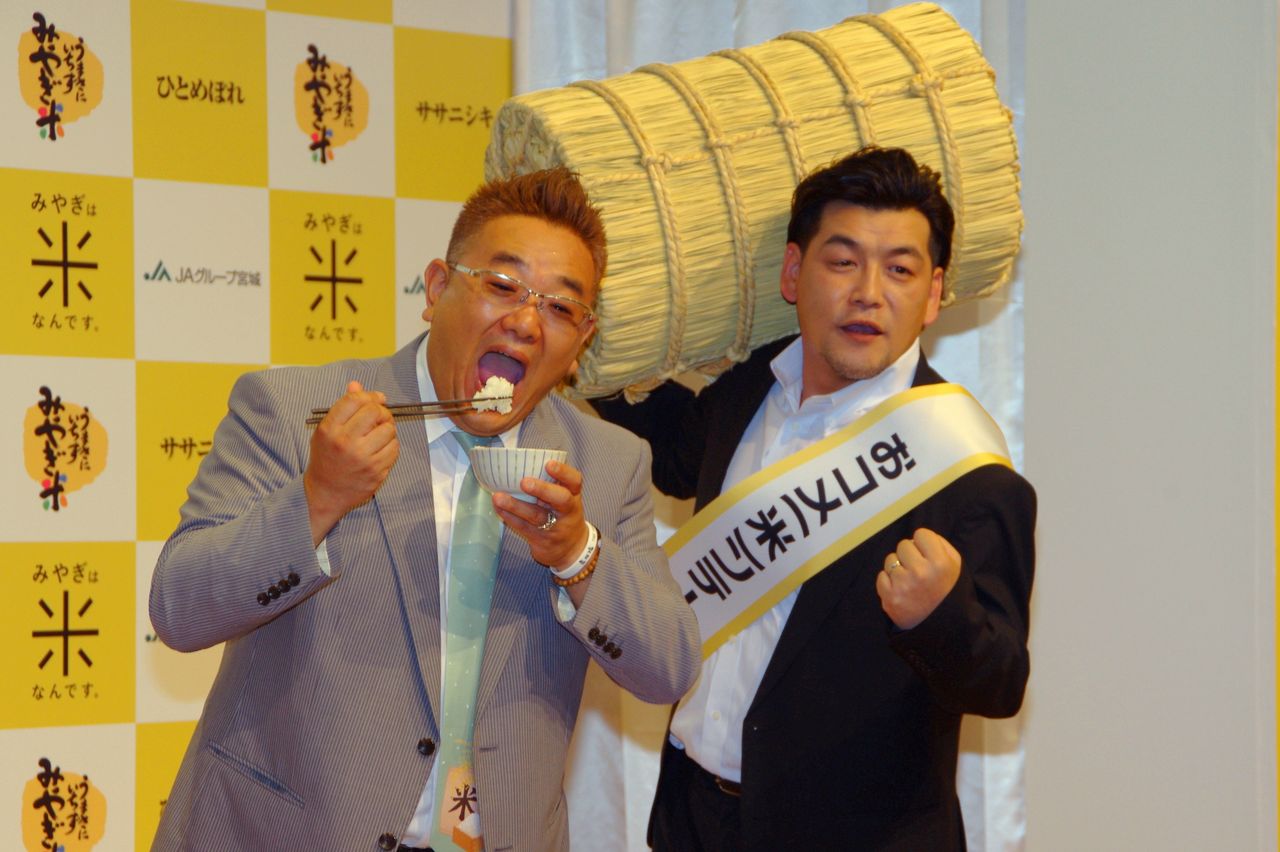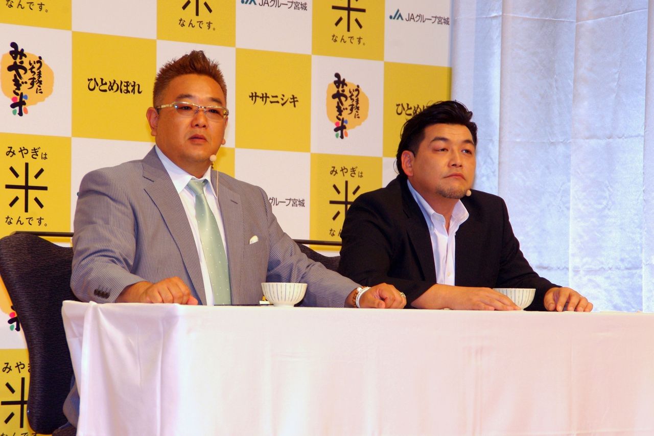 28日に行われた記者発表会では、サンドウィッチマンの二人が「おコメ(米)ンテーター」の座と「ひとめぼれ」1年分をめぐってみやぎ米の食レポ対決を展開。