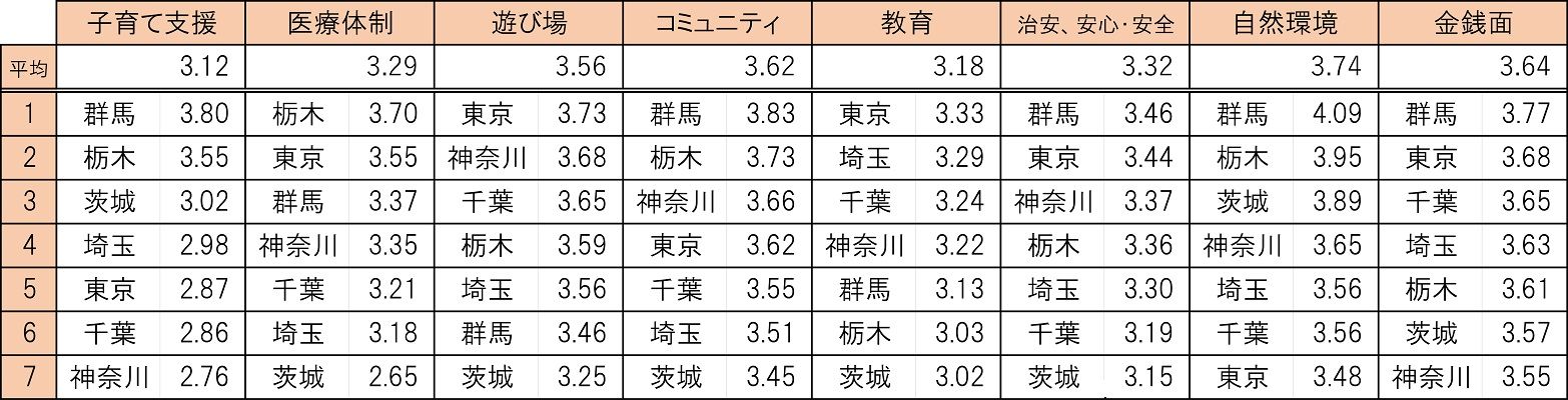 栃木は「医療体制」の項目で1位、東京は「教育」の項目で1位。関東だけでも、子育てに関して各都県でそれぞれの長所に特色があることがわかります。パパ・ママ/プレパパ・プレママが引っ越しを考えるときには、その地域の特色をよくよくリサーチするのがよさそうです。