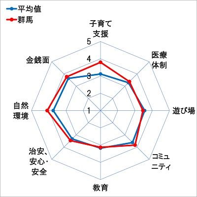 この調査では、関東1都6県に住む1歳までのお子さんのいるパパ・ママが、「子育て支援」「医療体制」「遊び場」「コミュニティ」「教育」「治安、安心・安全」「自然環境」「金銭面」の8項目について5段階で評価をし、その平均結果を5点満点の点数に換算。群馬県は、この8項目のうち、なんと5項目(「子育て支援」「コミュニティ」「治安、安心・安全」「自然環境」「金銭面」)で1位の結果となっています。