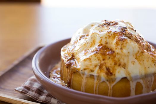 特製シロップに浸し、表面を国産バターでこんがり焼き上げたフレンチバウムにアイス、ブリュレクリームをトッピング。