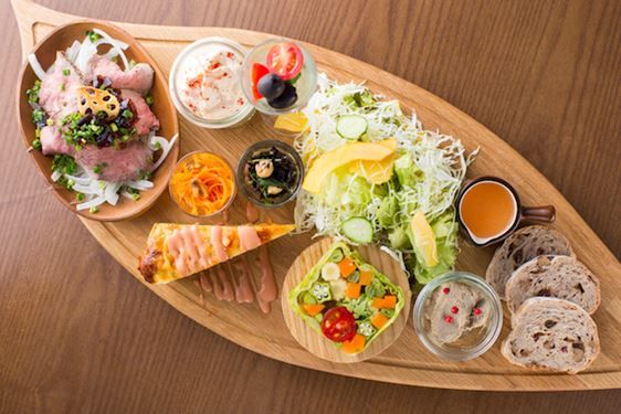 ランチタイムで提供する、地元農家が育てた「かずさ野菜」がふんだんに使われた「かずさ彩り野菜のプレート」。野菜のキッシュ、野菜のテリーヌ、野菜のムースに小鉢とピクルスが付いたプレートで、「ポットパイ」もしくは「自家製ローストビーフ」から選べる。(ポットパイは3種類から1つ)