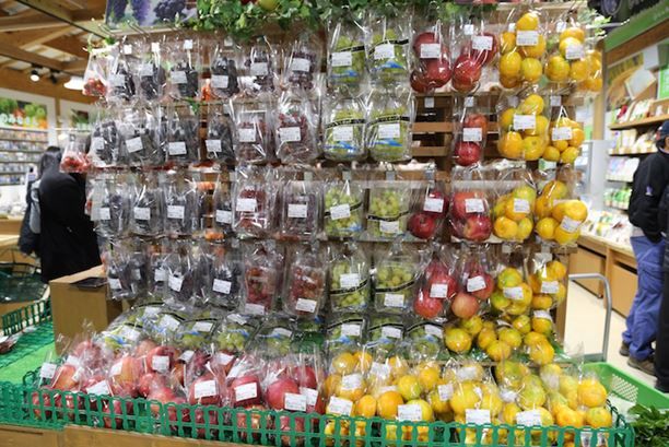 壁に掛けられた野菜や果物も。斬新なディスプレイは見ているだけでも楽しめる。