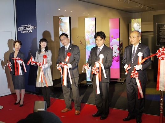 セレモニーではリニューアルオープンを記念してテープカットが行われた。(写真左から日本動画協会の石川理事長、「Wake Up, Girls!」の田中美海さん、新宿区寺田副区長、株式会社タツノコプロ桑原社長、大日本印刷株式会社浅羽執行役員)
