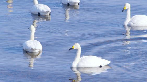 猪苗代湖では、四季折々の表情を楽しむことができる。冬の風物詩は、シベリアから飛来する白鳥だ。例年11月〜3月頃の間、およそ2000羽以上もの白鳥が猪苗代湖で羽を休める姿を見ることができる。