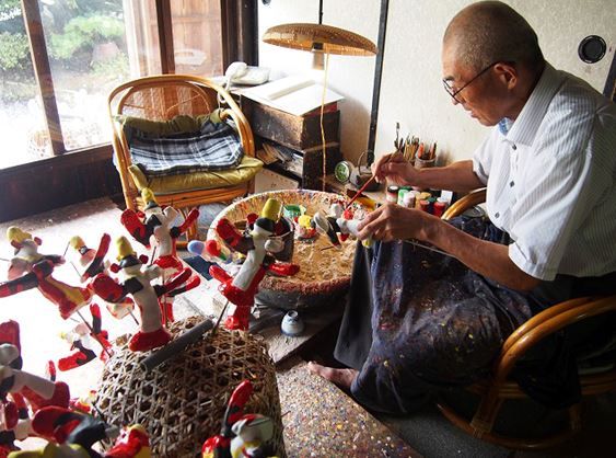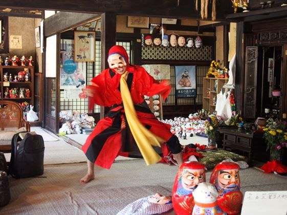 高柴デコ屋敷の「恵比須屋橋本広司民芸」では、この「七福神踊り」や「ひょっとこ踊り」の名人でもある橋本広司さんが目の前で迫力ある踊りを披露してくれるほか、自ら張子の面をかぶって⼀緒に踊ることもできます。是非、高柴デコ屋敷で忘れられない体験をしてみては。