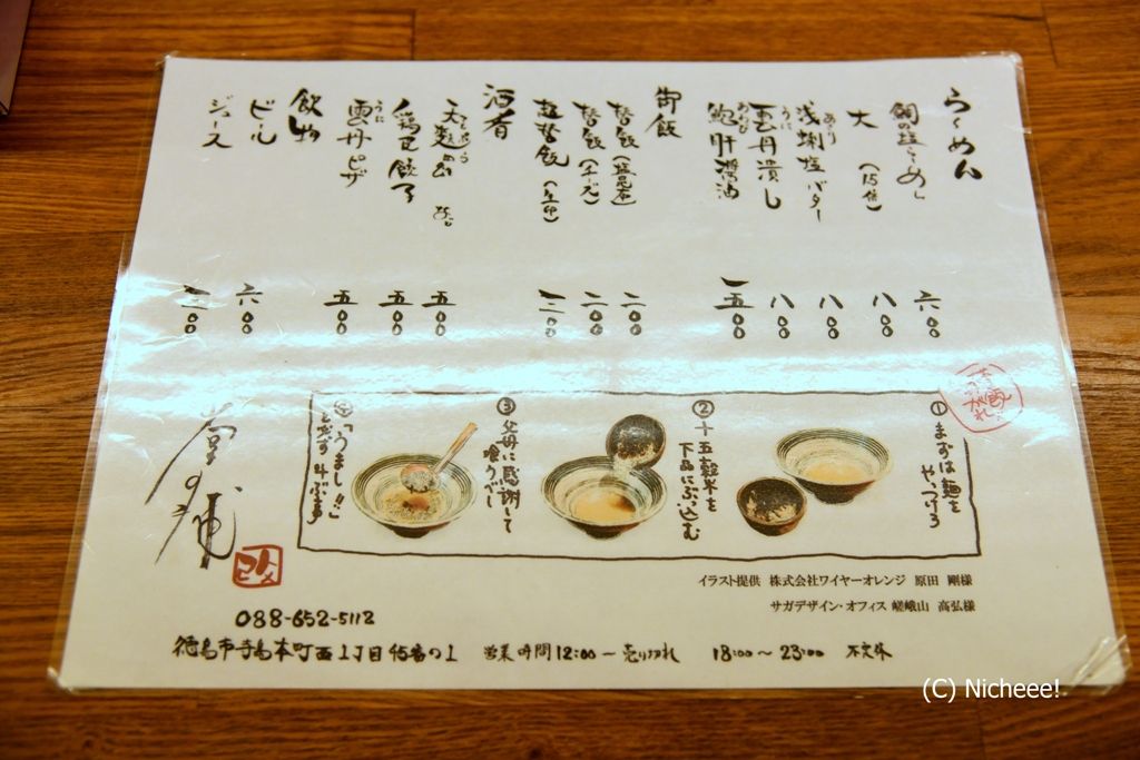 もともと、居酒屋の食材で余った鯛を有効活用しようと、鯛の出汁、鯛の皮をカリッと揚げ、こだわりのストレート細麺で、居酒屋のメニューとして提供したのが始まり。ラーメンのあまりの人気ぶりに、徳島駅前にラーメン専門店として出店に至ったとのことです。駅前店は昼も営業しています。