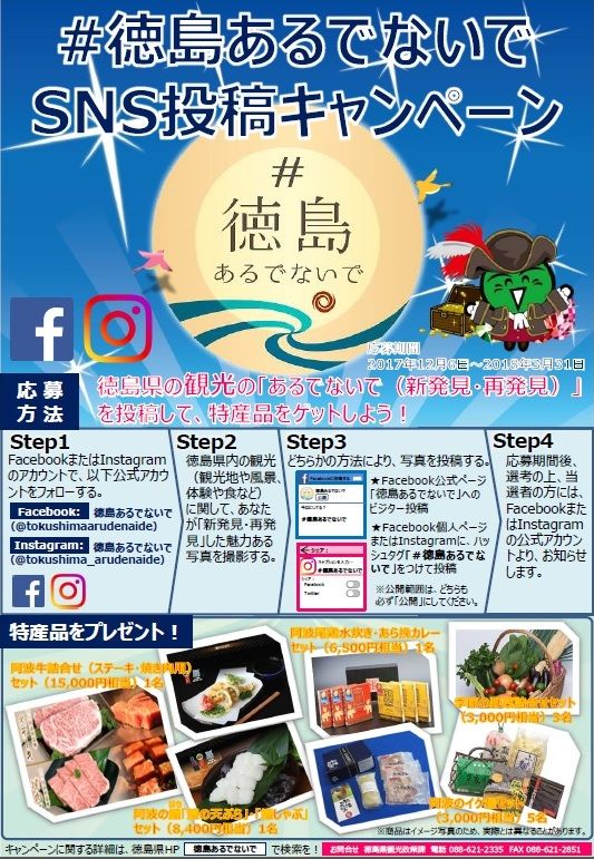 そして、徳島県内の観光スポットや風景、体験したことやグルメといった徳島の観光に関することで、自分が新発見、再発見したことを撮影し、ハッシュタグ「#徳島あるでないで」付きで投稿する。Facebook公式ページ「徳島あるでないで」へのビジター投稿も可能だ。期間中、何度も応募できる。
