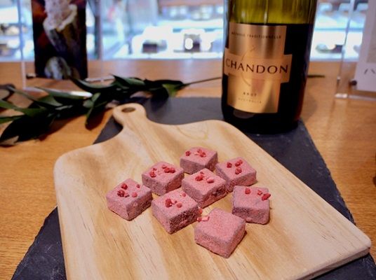 モエ・エ・シャンドン社のワイナリーで作られるプレミアムスパークリングワイン “シャンドン ブリュット”を使用した「シャンドンの極上生チョコ」。シャンドンのエレガントなシトラス系の香りと、ベリーの甘味・酸味の贅沢なハーモニーが味わえる。甘酸っぱいながらも口溶けがよく、なめらかな食感が魅力。上品なピンク色の見た目が華やかで、プレゼントにもピッタリな大人のための生チョコだ。