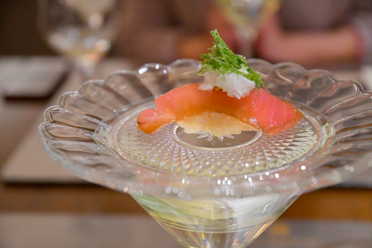 料理は、本日のお造りから、1品ずつ運ばれてきた。「スシティーニ」と名付けられたマティーニの上にマグロの漬けのにぎりが乗っていたり、「ブラック」は黒米クラッカーにキャビアと柚子がトッピングされたりと、通常の寿司とは異なる高級さ。キャビアをはじめ、フォアグラ、白トリュフ、ゴールドリーフ、ロブスターなどの高級食材が随所に使われているのも満足度が高い。