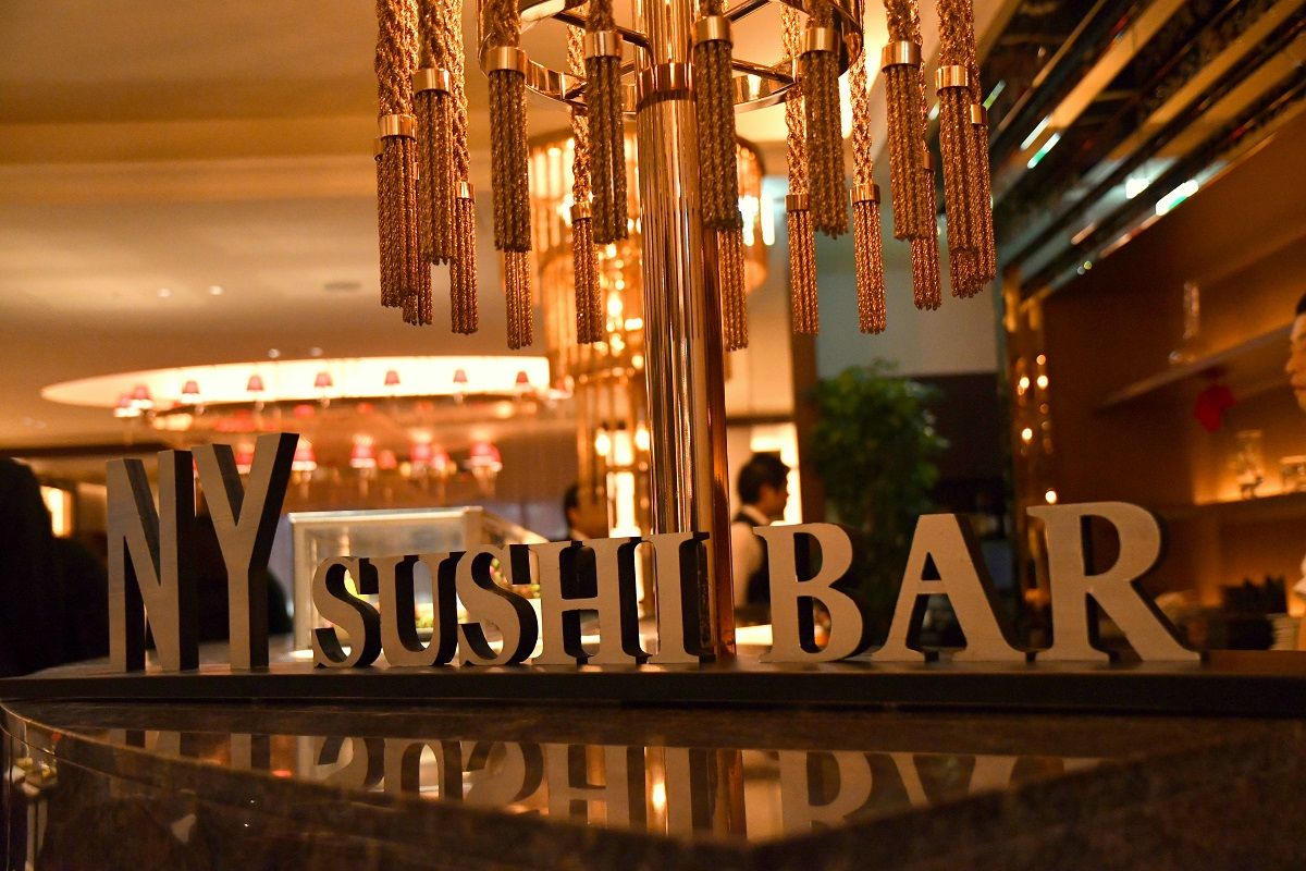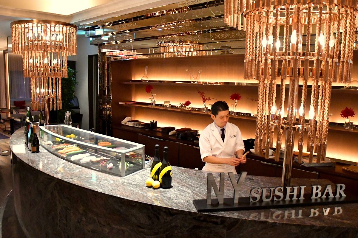 場所は、ホテル内にあるフレンチビストロ「ル ドール」2階のサロンスペース。道路に面して開放感ある1階よりもプライベートな感じで、ゴールドが基調でラグジュアリーな雰囲気が漂う。入口すぐのカウンターに「NY SUSHI BAR」、そのカウンター上にあるショーケースには鮮魚などの食材が並べられ、よくある日本の高級寿司店とは趣が明らかに違った。