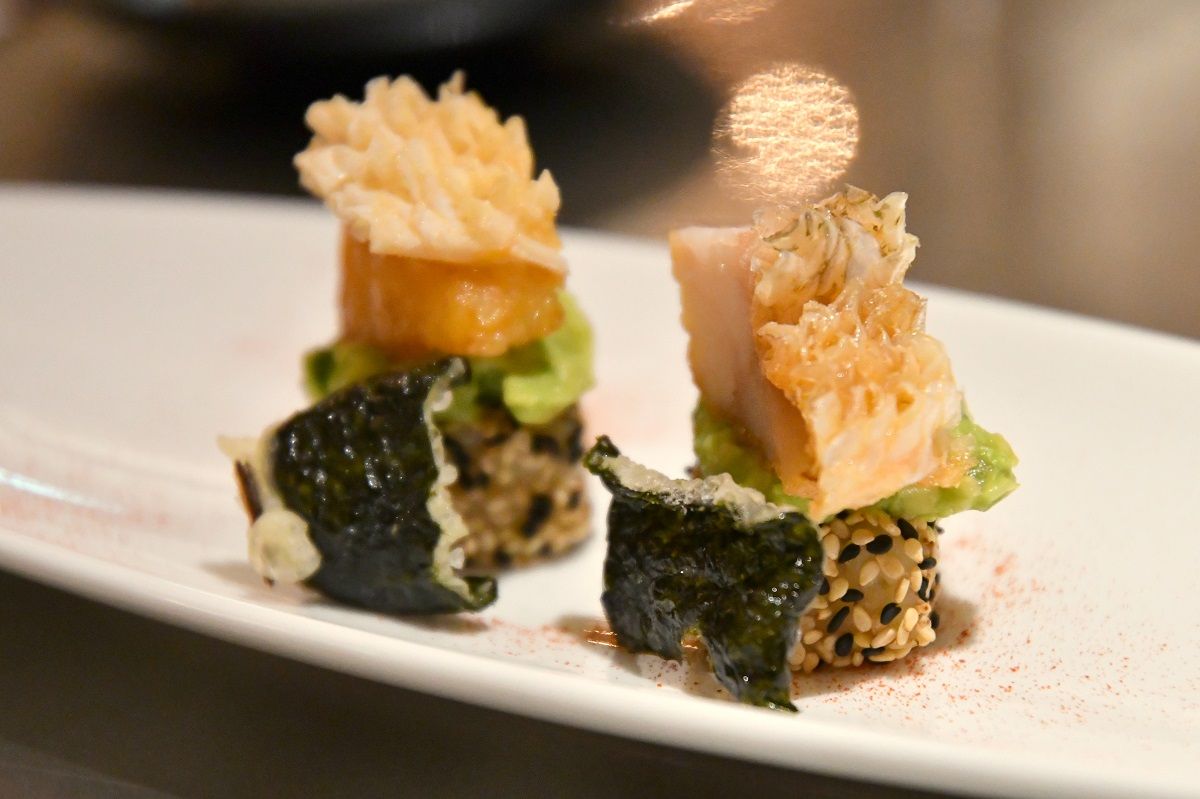 白米だけでなくハーブ米、玄米などが用いられていて、意外なほどに寿司との相性が良かったのに驚いた。「ファイアービーフ」では、客が国産牛を自ら焼いてハーブ米に巻いて食べるスタイルで、自分で焼き加減を調整でき、焼きたてが味わえる。最後に提供されたもち米、チョコレート、ナッツで作られた「クロッカンティーノ」まで和洋折衷なスイーツで、料理を存分に堪能することができた。