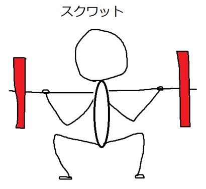 スクワットは、肩にバーベルを担ぎしゃがんで立ちあがる。