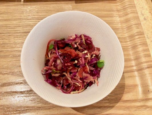 赤キャベツとキャベツで作られた見た目も楽しめる色鮮やかなサラダ。優れた栄養価からスーパーフードとして話題のクコの実、抗酸化作用のあるクランベリー、オメガ3が豊富に含まれている菜種油もプラス。