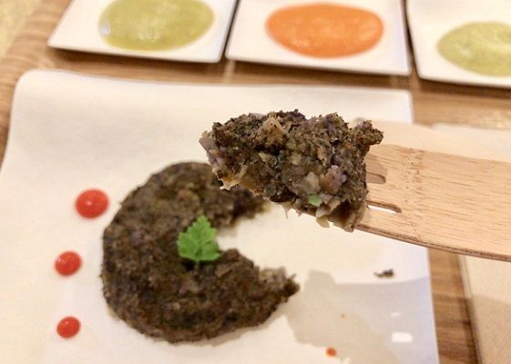 さまざまなスパイスが効いたパテは香り高く、挽肉のような食感で食べ応えも抜群。4種類のソースと組み合わせることで味の変化も楽しめる。