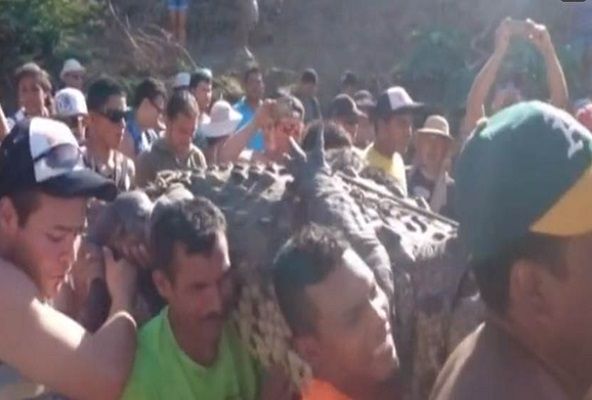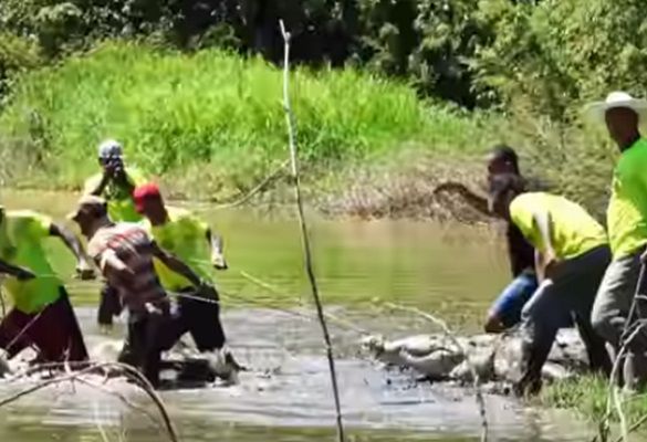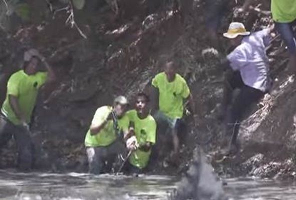 ワニを追い込んだハンターたちは集団でワニを取り囲み、そのまま素手でワニを捕獲してしまう。そのまま陸に担ぎあげるというなんともアドレナリン全開なやり方でワニを川から引きずり出すのだ。