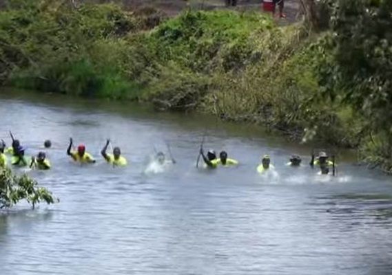 複数の男性グループが、地元の川に集まり、棒を使って水面を刺激しながらワニを追い込む。この時に川の底には定置網のようなネットが仕込まれており、男たちは一列になりながらワニを川の隅の方に追い込んでいく。
