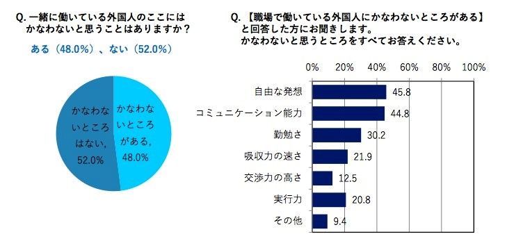 一緒に働いている外国人に対し「ここはかなわないな」と思うことがあると回答した方はおよそ半数。中でも「自由な発想」(45.8%)ではかなわないと答えた方が多かったようです。日本では就職活動の段階からすでに画一化が是とされる風潮があるので、突飛な発想が出てきづらいのかも知れません。