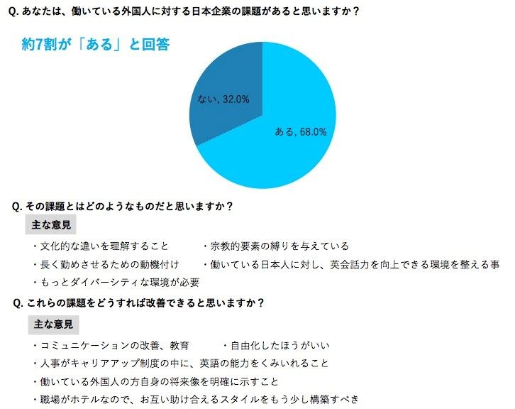 では、今後さらなるグローバル化を目指す上で、日本の企業には何が必要になるのでしょうか。今回の調査では、約7割の方が日本の企業に「課題がある」と回答。「文化的な違いを理解する」「働いている日本人に対し、英会話力を向上できる環境を整える」といった意見がありました。