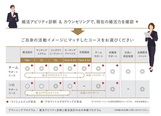 ソロサポートコースは、コンシェルジュによる活動プランをもとに自分のペースで婚活を進めるコース。