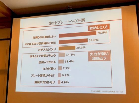 冒頭ではホットプレートユーザーのニーズについての紹介が行われました。ホットプレートを購入する理由として「出来立ての料理を楽しみたい」というユーザーが多い一方で、「仕舞うのが面倒」「収納場所に困る」「お手入れしにくい」という不満も目立っているのだそう。さらに温まるまで時間がかかることで、調理中のストレスを感じるという意見も。