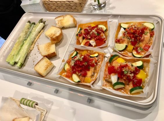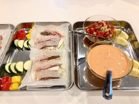 まずは「白身魚と夏野菜のトマトクリーム蒸し」から。クッキングシートに食材やソースを入れてセットします。