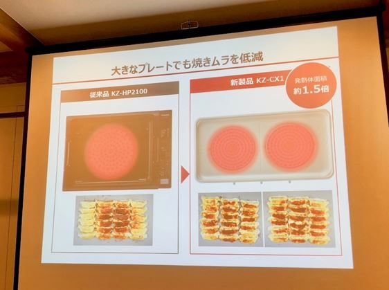 お披露目された「IHデイリーホットプレート(KZ-CX1)」。従来のホットプレートのイメージを覆すような薄さとスタイリッシュなデザインに目を奪われます!生活感をあまり感じさせないので、テーブルに置いたまま使えそうなお洒落なビジュアルも魅力です。