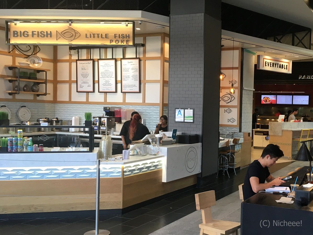 先日、ロサンゼルスの中心部に近い場所にあるショッピングモール、ウエストセンチュリーシティのフードコートで見つけたのが、「Big Fish Little Fish Poke」というお店。並んでいたのは皆、地元のアメリカ人でしたが、興味があったので食べてみました。