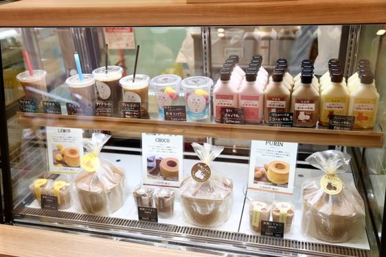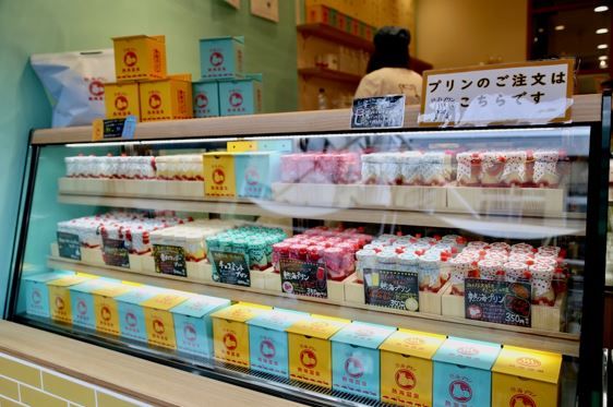 ショーケースにズラリと並ぶプリン。牛乳瓶に詰められたプリンはレトロ可愛いさたっぷり!2号店では、定番の「熱海プリン」5種、「風呂(ふろ)マージュプリン」2種の7種のラインナップ。