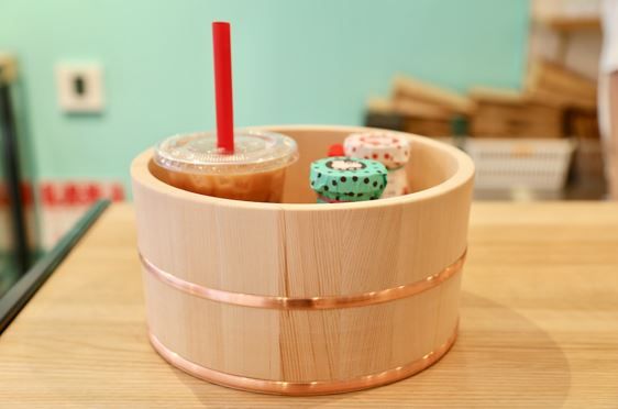 レジでオーダーした商品をこの風呂桶に入れてカフェスペースへ。ユニークな演出に、ワクワク気分も一層高まります。