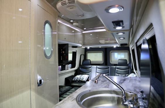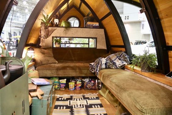 中は車内とは思えないほどお洒落で居心地良さそうな空間。ベッドやソファに加え、生活に必要な設備も備わっておりまるで自宅にいるような気分にもなれる。