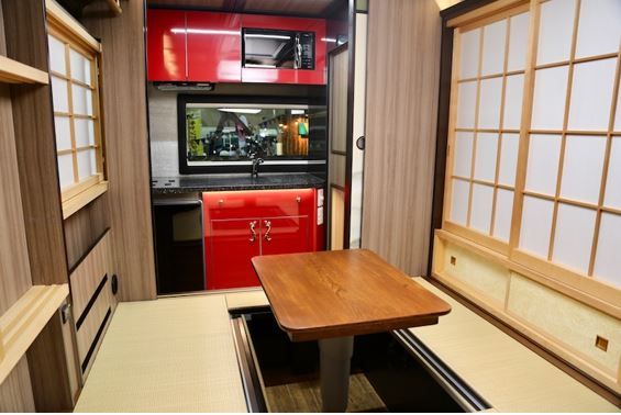 車内は従来のキャンピングカーのイメージを覆すような、完全なる和の空間。リビングは掘りごたつ式なのでより寛ぎやすい。キッチンスペースやトイレも完備。