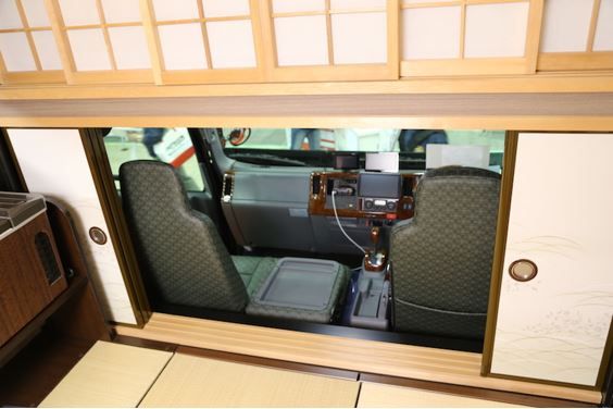 運転席とリビングスペースは襖で仕切ることも可能。さらにバンクベッドは障子で閉じられるので、和ならではの落ち着いた雰囲気が一層味わえる。