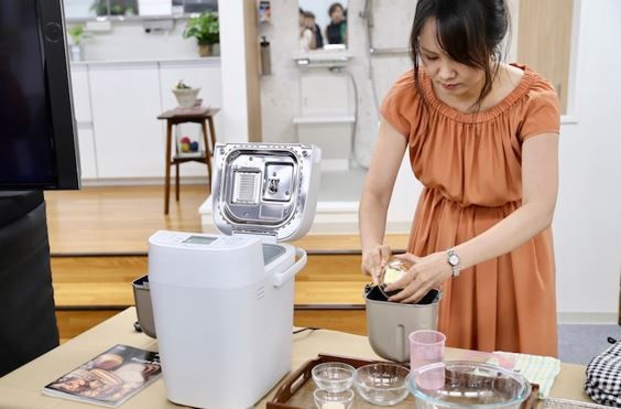 今年10月に発売予定の新ホームベーカリー「SD-MDX101」を使ったパン作りも披露されました。パンケースに強力粉などの材料を、イースト容器にドライイーストを投入してコースを選択するだけでスタート完了。