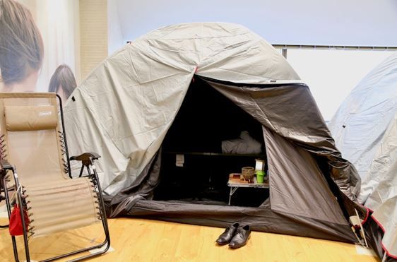 テントの中は外から見るよりもかなり広々。仮眠にぴったりなキャンプ用ベッドも設置。テーブルには耳栓なども用意。まるで本物のキャンプを体験できるような空間となっています。