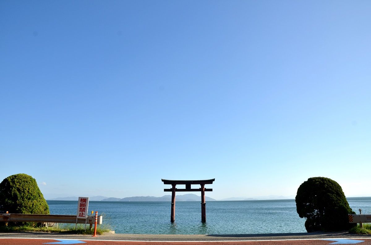 白鬚神社の大鳥居は、高さが湖面から約10メートル、柱と柱の間も約8メートルある。神社の境内から国道161号線をはさみ、琵琶湖の中にまるで浮かぶようにそびえ立っている。特に、日の出の時刻になると、大鳥居と琵琶湖から昇ってくる朝日を眺めることができ、とても神々しい光景が見られる。