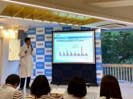 セミナーの冒頭では済生会横浜市東部病院 小児肝臓消化器科 十河剛医師よりノロウイルス感染の特徴や、発症した場合の対処方法の説明が行われた。感染症胃腸炎の原因病原体はノロウィルスの他にもロタウィルスやサボウィルスなど様々あり、毎年紅葉の季節頃に流行が始まるとのこと。