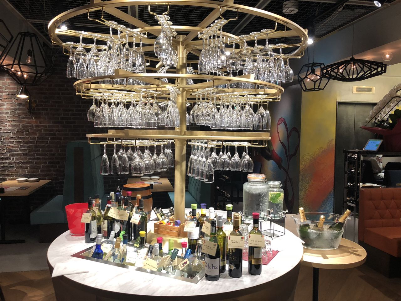 お店に入ってまず目に付くのは様々な種類のワインが並べられたワインシャンデリア。上部に並べられた沢山のワイングラスに、店内の照明が反射しとても綺麗です。そして下部には、大量のワインボトルが所狭しと並べられています。