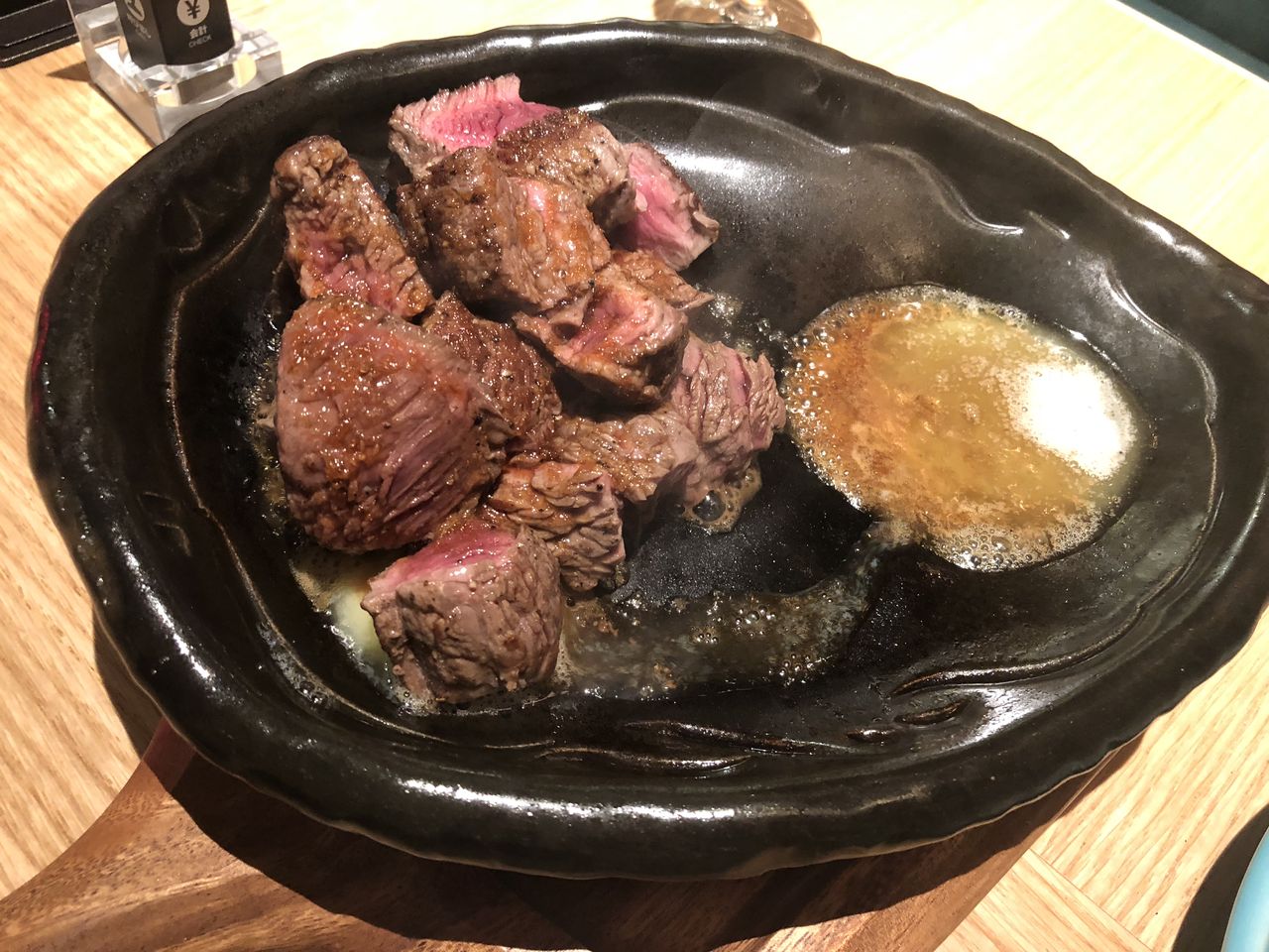 ということで「自家製ブラータのカプレーゼ」と「極み国産ヒレ 200g」を注文。お肉のソースはガーリックバター醤油にしたのですが、店員さんに「バケットもすごく合いますよ」と言われたので一緒に注文しました。