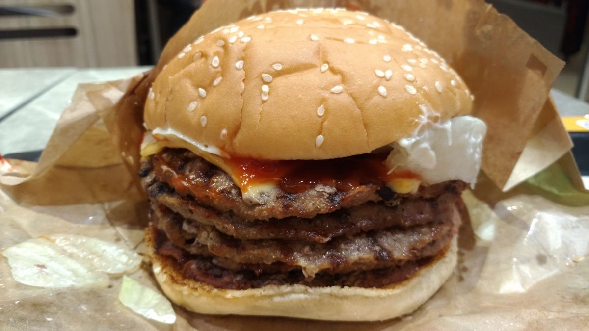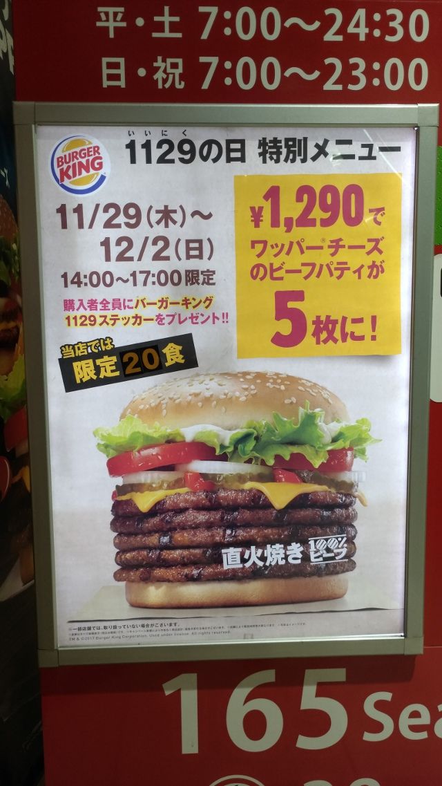 中でもとりわけインパクト大だったのは、バーガーキングが11月29日から12月2日に開催していた「いい肉爆盛り感謝祭」で提供された、ビーフパティ5枚入りのワッパーチーズだ。