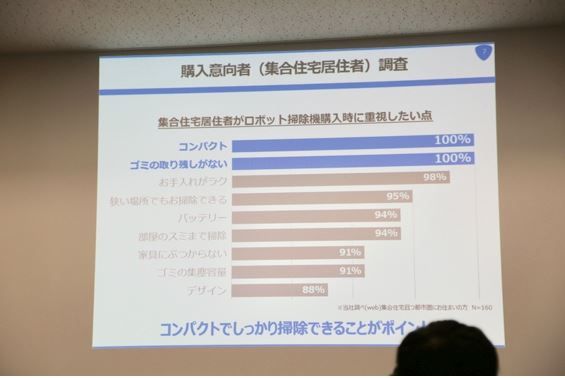 日本の住宅事情について、全国的に見ると一戸建ての割合が多い一方、都市圏ではマンションと集合住宅が7割を占めるという。またパナソニックの調査によると集合住宅居住者のうち、ロボット掃除機の購入意向者は51%にのぼったものの、実際に利用しているという回答は36%にとどまったとのこと。さらに集合住宅居住者がロボット掃除機を購入するにあたって「コンパクト」「ゴミの取り残しがない」という点が重視されていることがわかったのだそう。