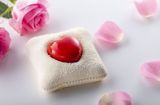 食感の生地は、バニラババロア、ストロベリースポンジ、ストロベリーフィユティンチョコクランチで仕上げられている。中央の赤いハートは、ストロベリームースとガラス細工のように美しいレッドミラーグレーズ。