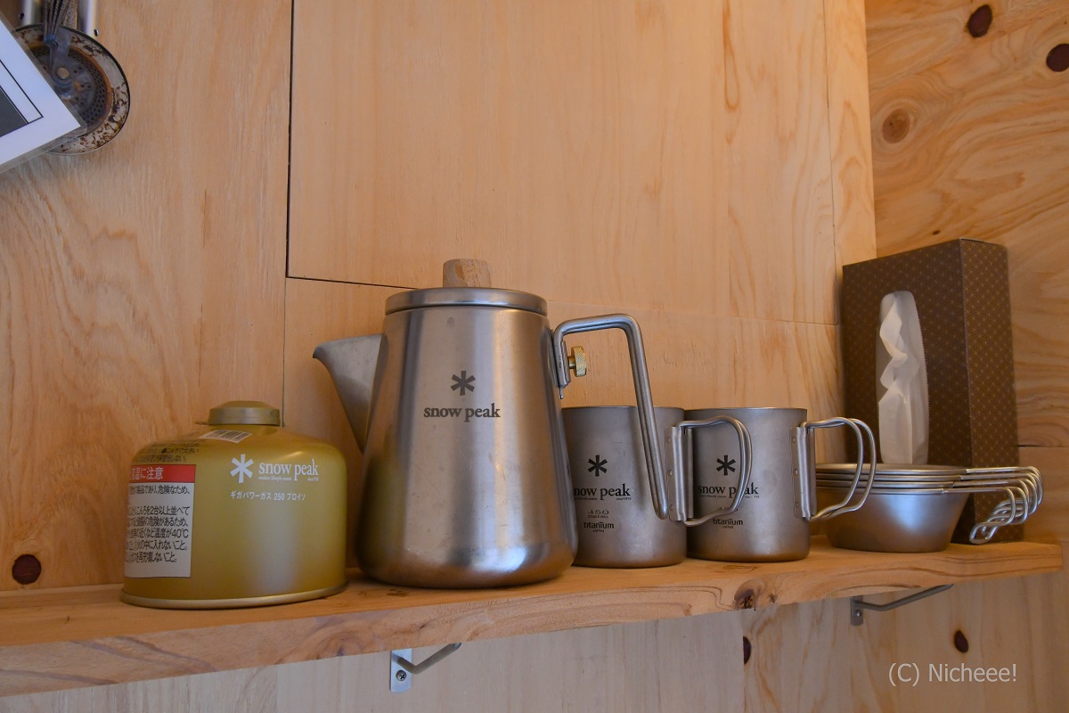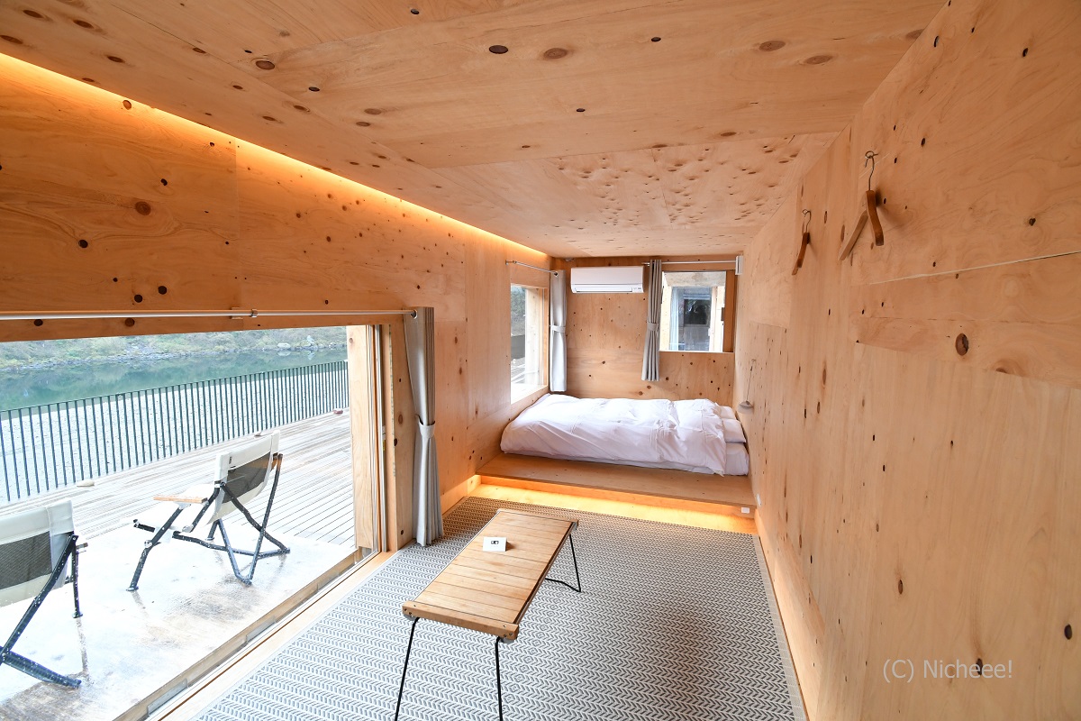 住箱(じゅうばこ)の内部にはベッドのほか、テーブルと洗面台、お湯を沸かす器具が備えられています。外のウッドデッキにはチェアも。トイレとシャワーは管理棟の近くにあります。内部に無駄なものが一切ないので、広々と感じます。